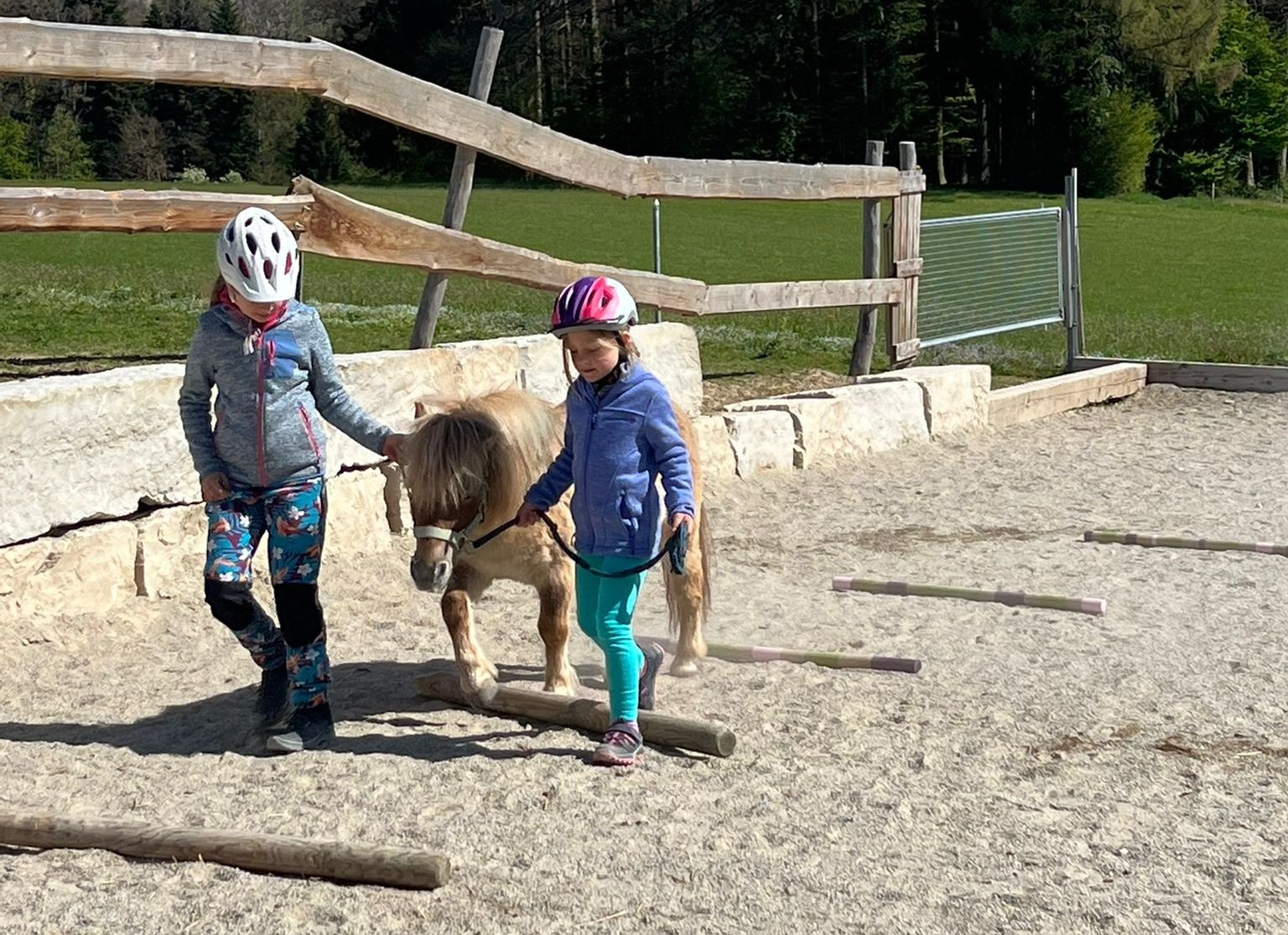 Wir striegeln, putzen und satteln die Pony's. Du hast die Möglichkeit, ein Pony zu führen und zu reiten.