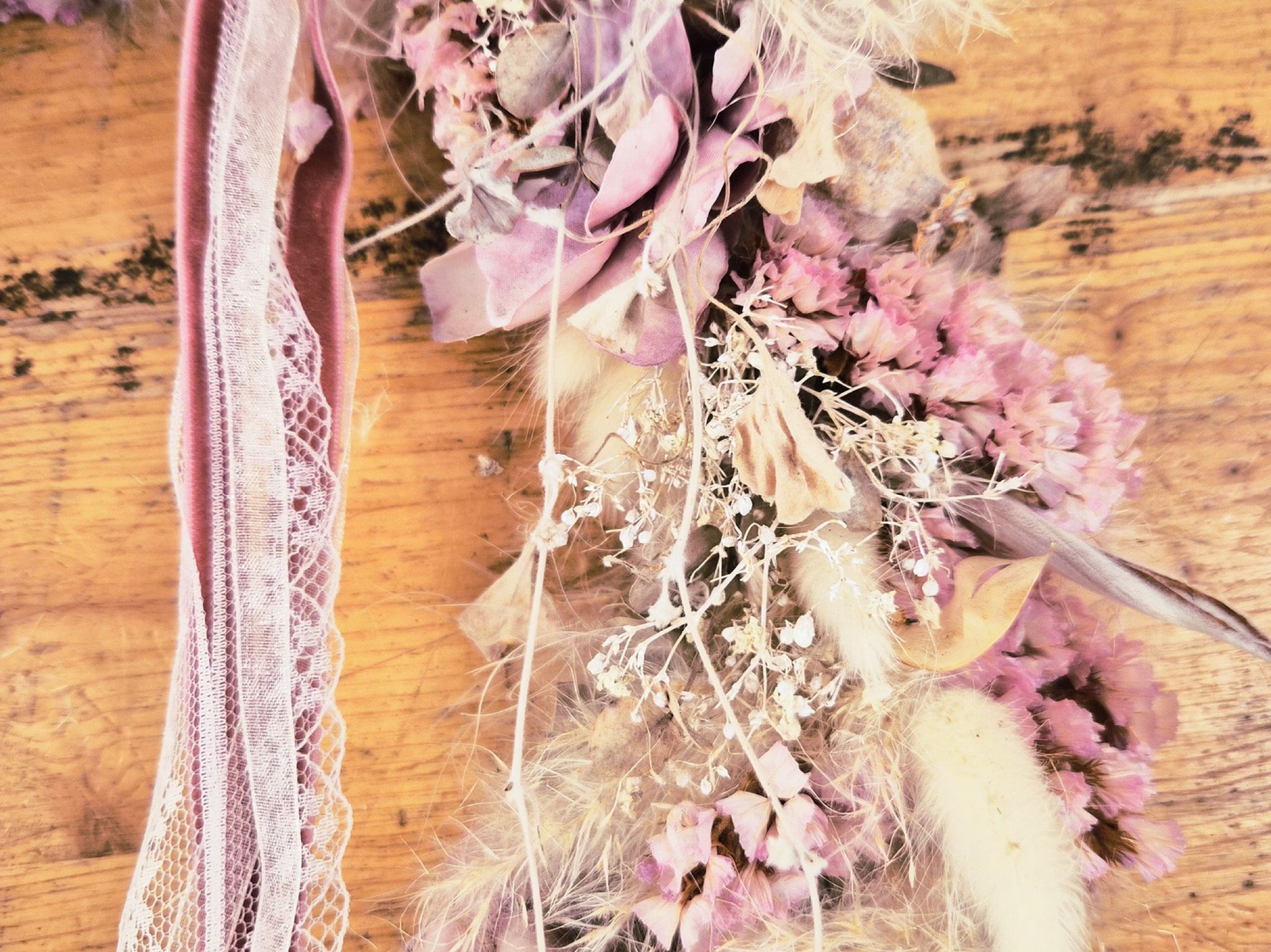 Wir binden einen Ring (22cm) mit diversen Trockenblumen zu einem Türkranz und verzieren diesen mit Band und einem Accessoire.
